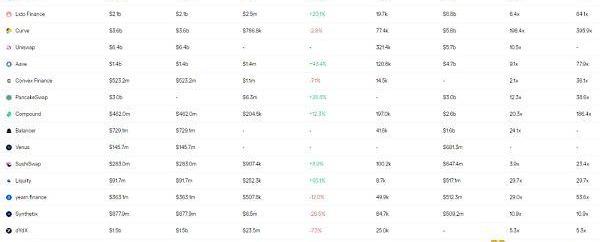 一些DeFi协议的各项指标数据,来源:TokenTerminal