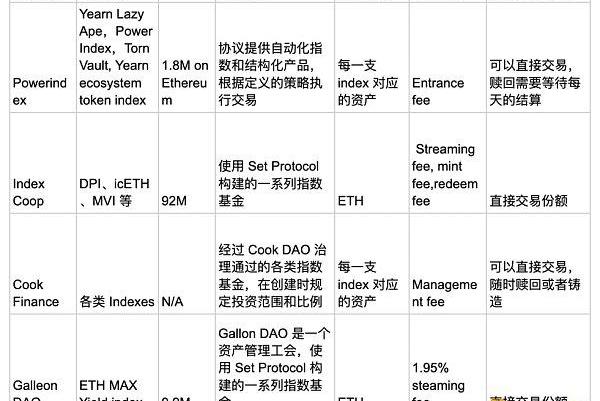 被动策略基金大都会发行erc20代币来表征基金的份额,投入的资金按照规则在调整的时候购买、出售对应的标的。平台会以staking奖励平台治理代币的形式吸引用户购买index基金,或以平台币激励DEX上该erc20交易对的流动性。平台允许用户在市场上交易基金份额,更接近ETF,并且能通过铸造和赎回份额的形式实现套利。