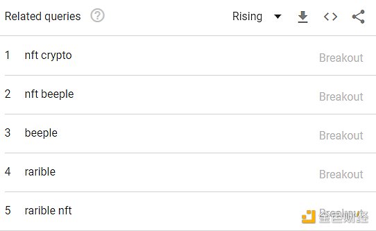 人们的主要搜索词:nft crypto、nft beeple、beeple、rarible、rarible nft。
