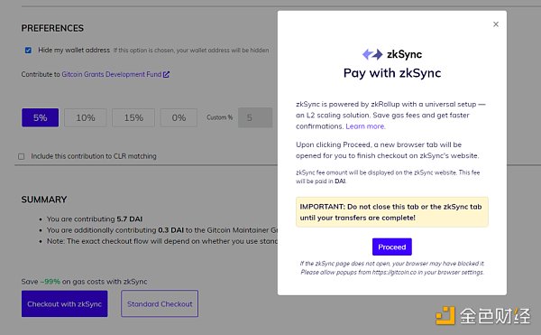 下一个页面是付款,有两种付款方式可以选,一种是右边的标准付款,一种是左边的使用zkSync付款。用标准付款,就是正常的以太坊网络付款流程,总共需要支付两次,一次是批准网络扣款,大概收费5美金的GAS费,第二次是捐赠转账,除了 1 DAI 的捐款,还需要支付约14美金的GAS费,两次GAS费都使用 ETH付款,GAS费随以太坊价格跟网络拥堵状态略有变化。