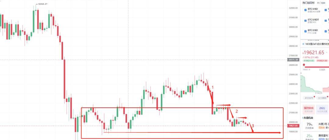 回到今天的行情,BTC目前处于一直震荡的位置,20800一直没突破,可见行情的弱势,并且这种下跌的行情一般会打完三浪,我们从图中也可以看到,目前处于2浪的调整,所以接下来大概率会有第三浪,同时也会跌到箱体的底部18900到19350,会是我们现货进场的好机会