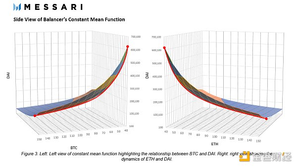 有趣的是,这个曲面与Uniswap的常量乘积函数并没有太大区别。另一种思考方式是将图1中的恒积函数,额外增加一个代表池中第三个代币的轴。通过改变图2的角度,两个函数之间的相似性变得更加明显。