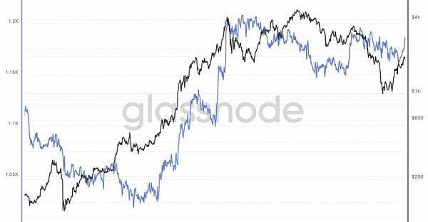 对于比特币,查看超过1,000BTC的地址数量很有趣。对于以太坊来说,超过10,000ETH的地址数量似乎更合适。这是K线走势图: