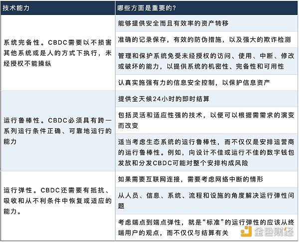 技术将在一定程度上影响数字货币的设计和功能。特定CBDC设计的业务和操作需求可能需要开发新技术。此外,访问或集成点(如数字钱包)可能需要额外的开发来满足操作标准。例如,可以离线操作的CBDC可能需要使用其他技术,如安全硬件。重要的技术开发和评估工作需要在三个核心领域:系统完备性(system integrity)、运行鲁棒性(operational robustness)、和运行弹性(operational resilience)。表1突出了支持CBDC的技术能力的关键方面。