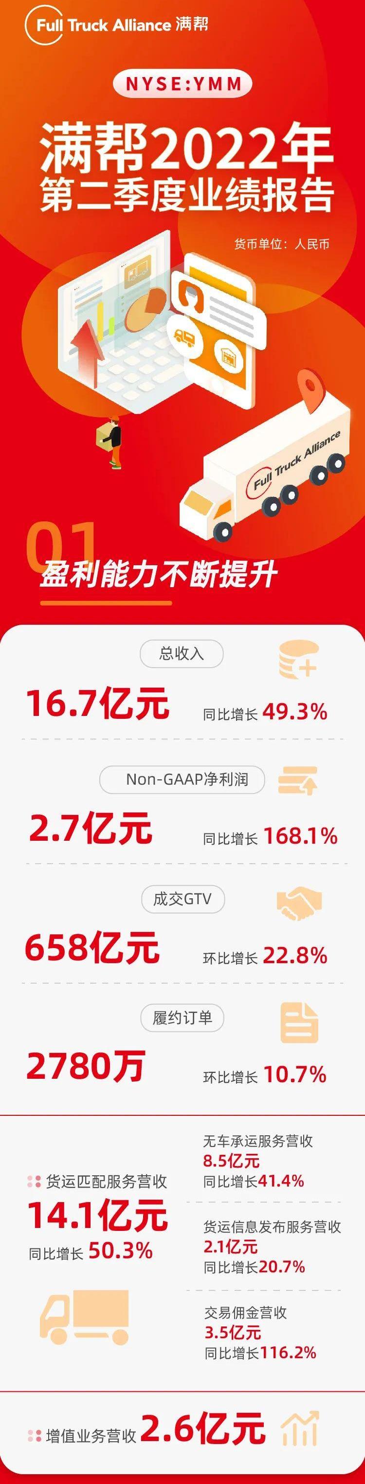 2022年第二季度,满帮实现营收16.7亿元,同比增长49.3%,超过Q1财报披露时给出的16.4亿元预期上限。另外,满帮实现Non-GAAP净利润2.7亿元,同比大幅增长168.1%。