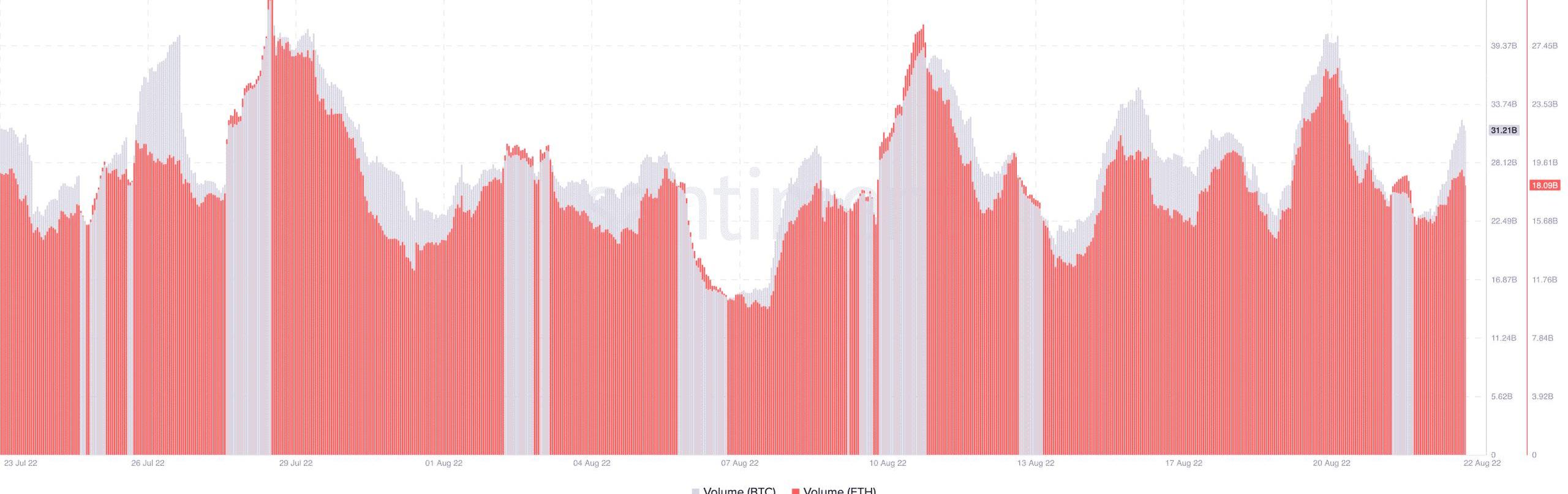 BTC的交易量在8月20日为403.1亿美元,截至发稿时已降至312.1亿美元。