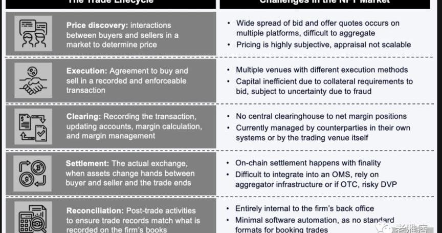 这个周期的最后一步是结算交易,这意味着资产的交换,然后确保结算按照约定进行,这被称为对账。链上市场最大的好处是即时结算,NFT是收藏品、艺术品和其他结算非标准化、成本高或需要专门保管的独特市场的重要证明点。如今的NFT结算利用了智能合约,可以实现原子交换,而不需要可信的第三方来协调交付与支付(DVP),这比其他类型的资产有巨大的优势。NFT来源很容易跟踪,真实性可以在链上验证。