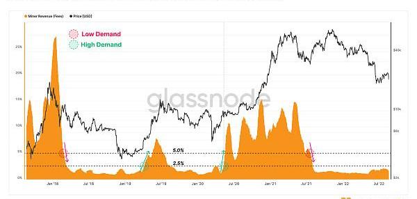 低需求:熊市实现的早期阶段经常与矿工收入的费用蒸发相一致。在这里,2.5%至5%的典型范围已成为市场需求高低之间的历史门槛。