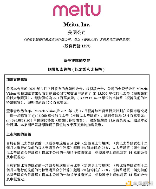3月17日晚间,美图发布公告称,全资子公司Miracle Vision进一步购买了1.6万单位的以太币,总对价约为2840万美元;386.08单位的比特币,总对价约为2160万美元。