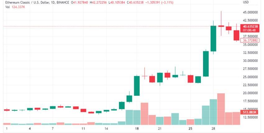 ETC于7月1日起,交易价格为14.93美元,达到每月高点44.97美元,测试每月最低点13.48美元,并以36.45美元收盘。