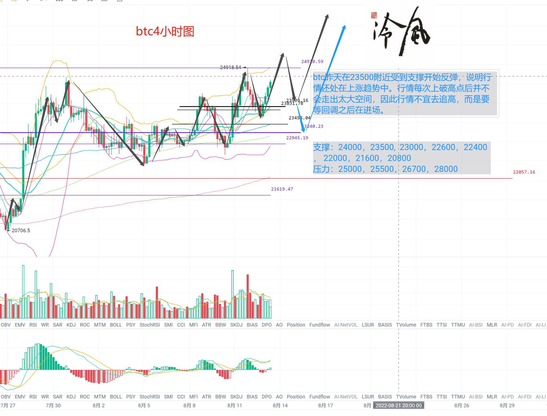 BTC短线支撑23000-23500美元,短线压力24500-25000美元。美三大股指全线反弹,有利于币市。对于行情冷风有二点说明,一是其实币市无论是大饼,以太,还是山寨小币,都已经上涨了近二个月,目前上涨的动因不足,陷入不上不下的走势很正常。个人认为短线仍有向上一冲的可能,但同样会有再次测试箱体的需求。走势矛盾,大家要且行且珍惜。二是大饼目前的走势类似于18年12月至19年4月以及2020年3月至10月,第一次盘整了5个月,第二盘整了8个月。按此推算大饼要走出上涨行情,至少要今年的11-12月份,甚至是明年2-3月份。其间的主要技术特征是币价小幅在一定区间内波动,短,中,长期均线粘合缠绕。磨人,磨人,非常磨人,但在市场陷入绝望时,会一阳绝尘,出现反转。