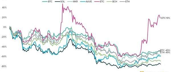 2022年3月,有关以太坊矿工考虑过渡到以太坊经典的消息开始传播,使得ETC的价格在11天内上涨了103%。尽管在合并后围绕新的ETHW分叉进行了猜测,但ETC再次上涨,自7月12日以来涨幅超过198%。围绕合并的猜测使ETC成为2022年表现最好的加密货币之一,年初至今上涨18%,而比特币等其他加密货币(BTC)和以太坊(ETH)已贬值近50%。