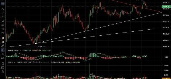 行情触及24900附近承压回落,低位跌至23760附近止跌反弹,昨日文中提及的多空两单双双获利,恭喜跟上的币友多单到达第一止盈,空单到达第二止盈,共计获利一千美刀,日线级别收倒锤子形态,行情未能有效突破上方压制较强,整体依旧触及区间震荡,幅图指标呈粘合状态,短期有回踩需求,若不破23600-23300区域支撑,则会再次上行,周线级别布林带缩口处于中轨上方,MACD空头转多双线有金叉迹象,KDJ三线金叉向上延伸,若本周收阳线,27000只是时间问题,日内思路建议高空低多,24200-24500空,目标23800-23600,23600-23300多,目标24000-24200