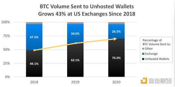 由于金融行动特别工作组者(Financial Action Task Force, FATF)强力执行旅行规则,而2020年推出的旅行规则系统TRISA(Travel Rule Information Sharing Architecture)只专注机构间的交易。下图是美国公布的比特币交易,2020年,大部分地下市场交易已经转为个人钱包,不在TRISA系统监管之下。这表示监管和被监管方的博弈中,上有政策下有对策。只有26%交易经过虚拟资产服务商,大部分人仍然选择逃离监管,这一转变在2020年已经完成。