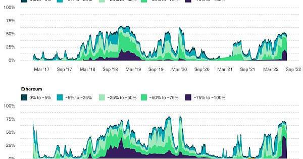 2020年1月1日至2022年7月18日按未实现损失范围划分的供应百分比。资料来源:BitwiseAssetManagement,数据来自Chainalysis