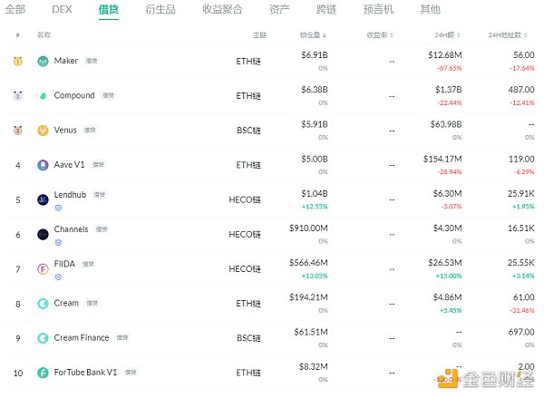 锁仓量排名前十的借贷平台 排名来源:DeFibox