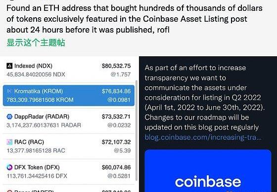 此事在2022年4月就已被提及,推特KOLCobie在其推文中表示,在一次Coinbase上币前,发现了在代币上线前大约24小时,出现了一个购买了数十万美元代币的ETH地址,该地址仅在Coinbase资产清单中出现。