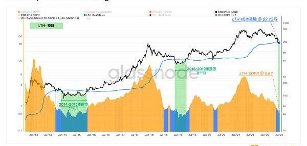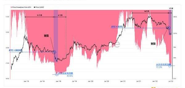 ?2021年11月-2022年7月:目前的熊市已经从前高位置回撤了75%,2.9万美元的底线也是类似的突破点基础水平。在6月中旬的投降中,价格在短短两周内跌至17600美元,跌幅为40%。