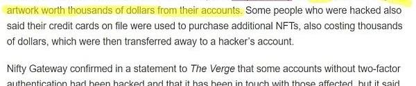 黑客也可以通过攻击NFT交易平台,盗取你的账户密码。通常黑客的攻击对象是未经双重验证的账户。NiftyGateway是一个线上艺术藏品拍卖平台,平台上有很多用户表示黑客从他们的账户中盗取了价值几千美金的数字艺术藏品,其中有一位受害者称自己被盗通证总价值15万美金。